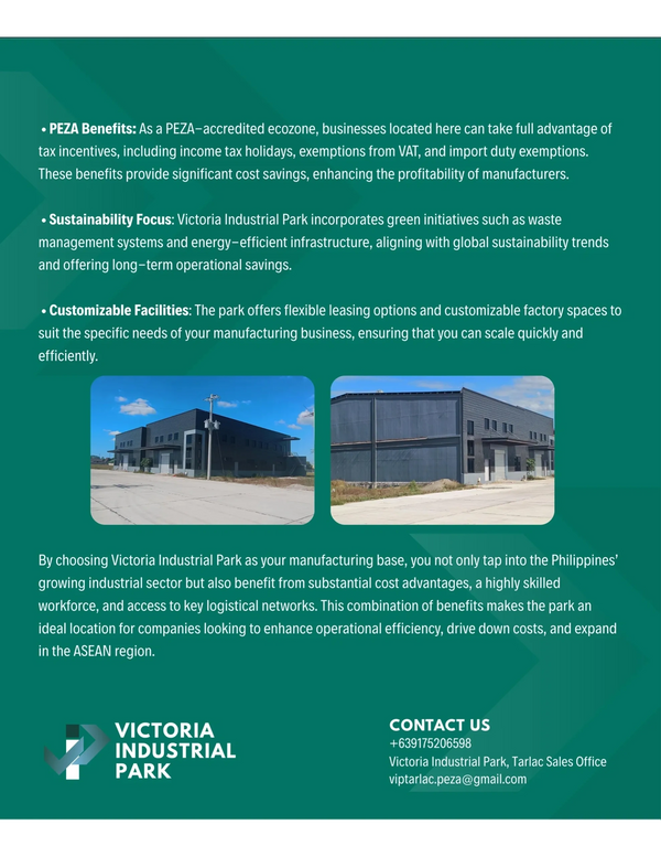 With its strategic location, regulatory ease, innovation-ready infrastructure, environmental foresight, and robust talent pipeline, Victoria Industrial Park is your gateway to industrial growth and global competitiveness in the heart of Luzon.