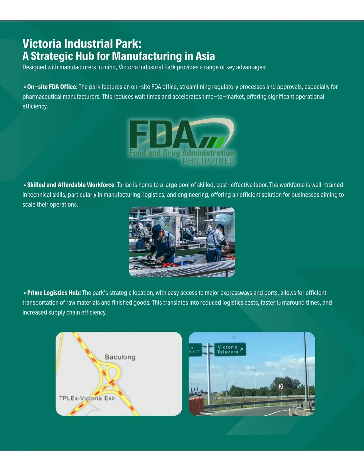 Victoria Industrial Park is a 30-hectare PEZA-accredited Special Economic Zone strategically located beside the Tarlac–Pangasinan–La Union Expressway (TPLEX), in the Philippines. It proudly features an on-site FDA office, positioning it as a prime hub for manufacturers seeking streamlined approvals and enhanced operational efficiency.